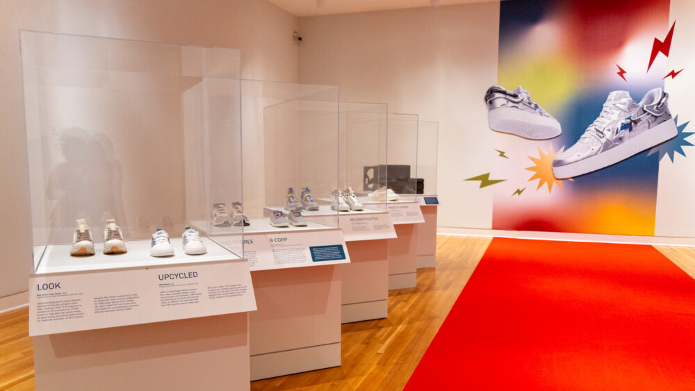 The exhibition includes digitally designed and 3D-printed shoes, sneakers made from mushroom leather and reclaimed ocean plastics, and footwear created for the metaverse.