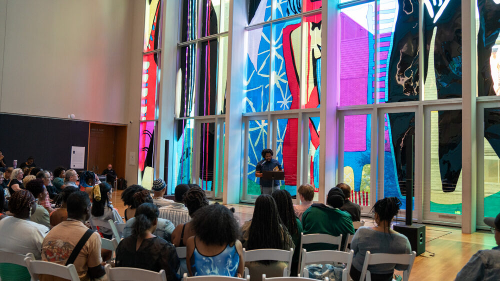 This grand space features a 60-by-60-foot glass wall overlooking Levine Avenue for the Arts and the Knight Theater. Summer Wheat’s Foragers reflects like stained glass, pictured on the left. The dramatic interior includes richly stained hardwood floors and a wood slat ceiling.